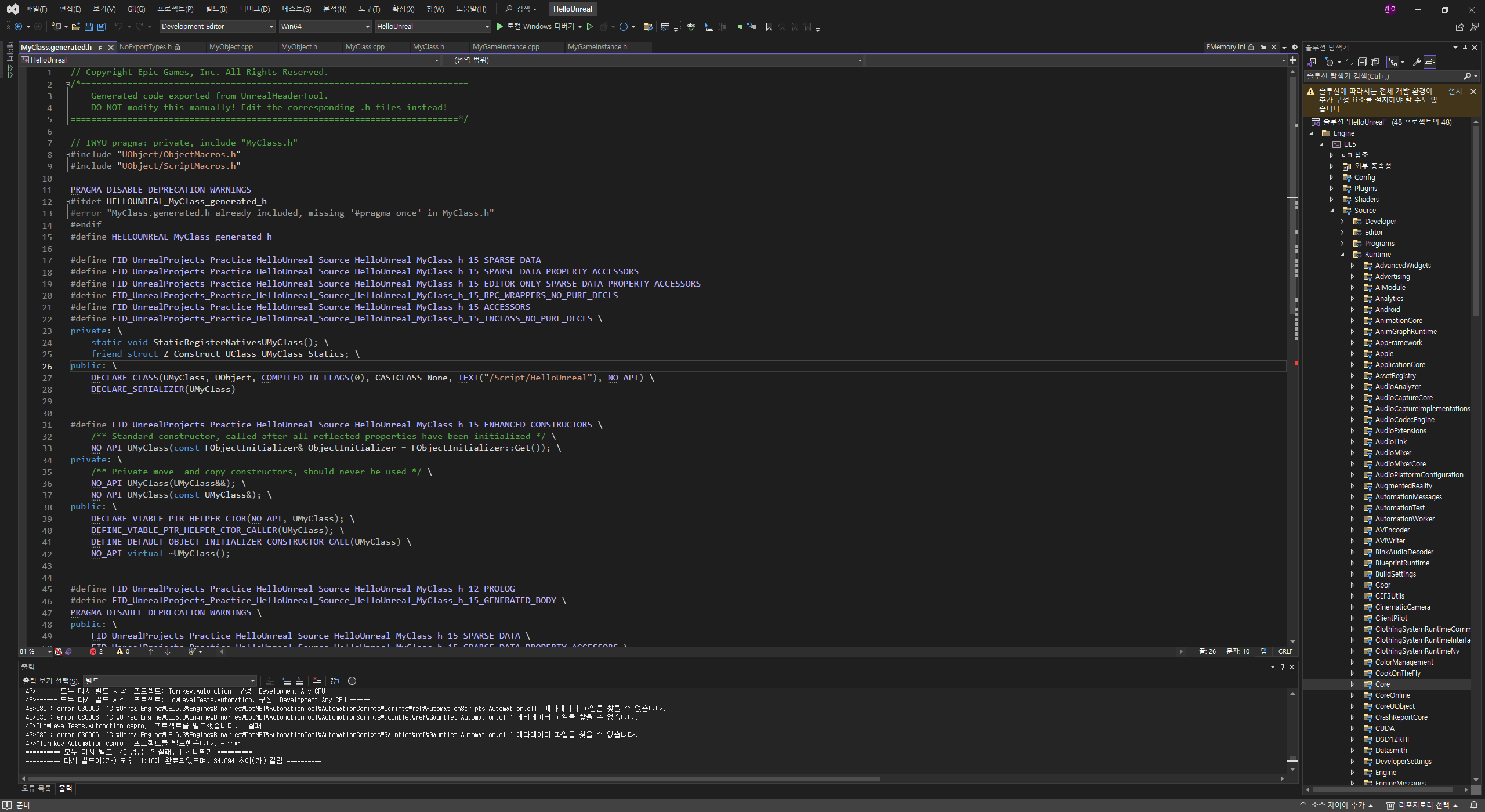 FID_UnrealProjects_Practice_HelloUnreal_Source_HelloUnreal_MyClass_h_15_GENERATED_BODY가 매크로로 만들어져 있는 걸 볼 수 있다!