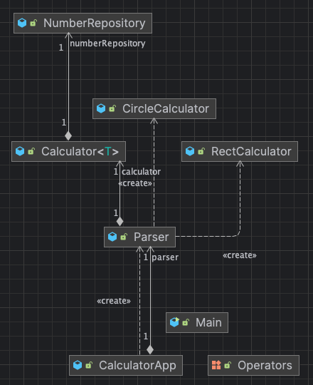 현재 위의 다이어그램을 확인하면, 다음과 같습니다. 현재 CalculatorApp이라는 것을 전반적인 프로그램을 실행하고 있습니다. 그런데 입력되는 값이 전부 유효한지 확인하기 위해서, Parser라는 클래스를 통해서 확인하고 각 클래스를 호출하게 됩니다.
