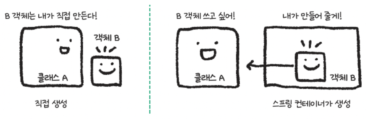 이렇게 스프링은 직접 생성하는 것이 아니라, 어딘가에서 받아와서 사용합니다. 여기서 위 같은 객체를 가져오는 곳은 Spring Container입니다.