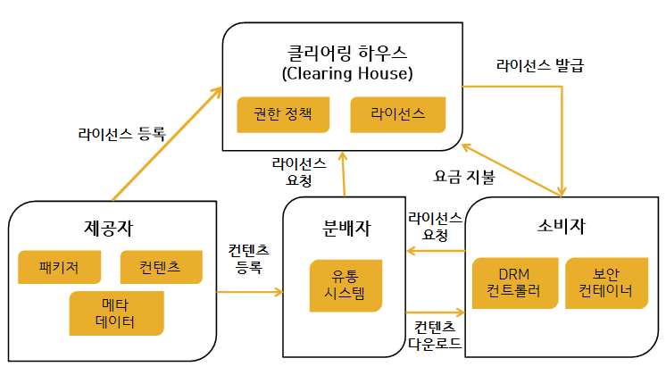| 클리어링 하우스 (Clearing House) | DRM 관련 라이선스 및 권리를 관리하고, 콘텐츠 제공자와 분배자 간의 거래를 조정하는 중개 역할을 합니다. |