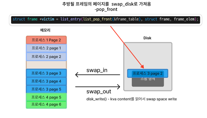 운영체제는 스왑 디스크로 내보낼 페이지(evict)를 선택한다.