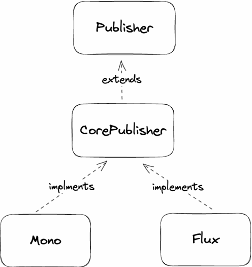 - Mono, Flux는 Publisher를 상속받는 CorePublisher를 구현