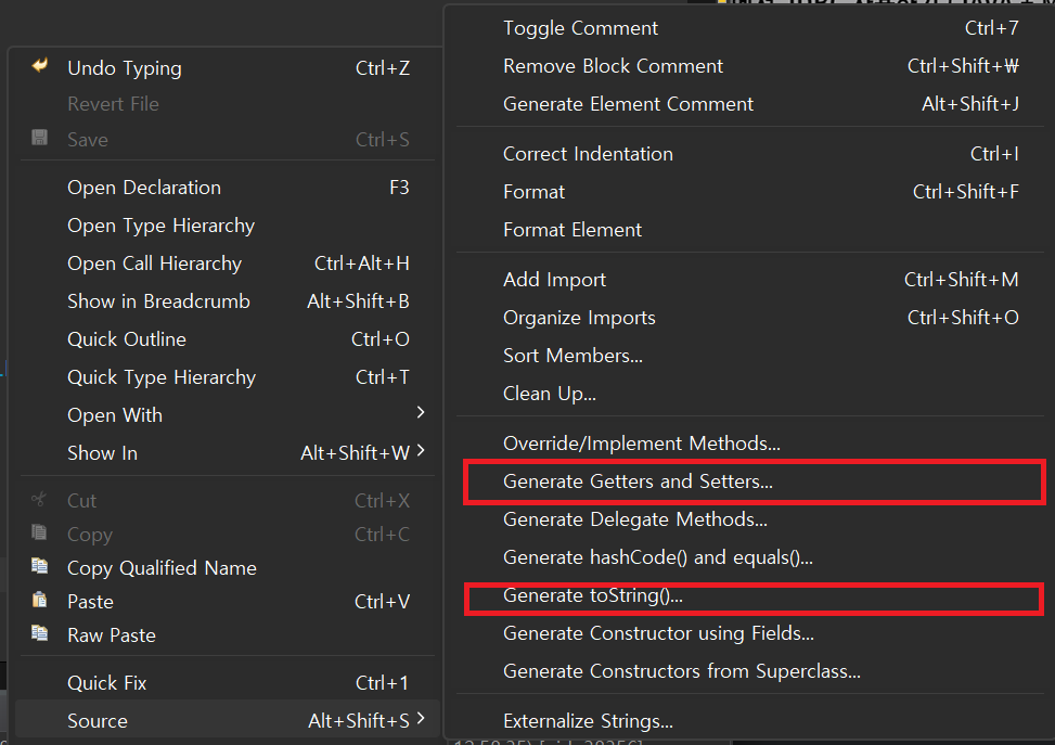 해당 클래스 파일에서 마우스 오른쪽을 클릭하고