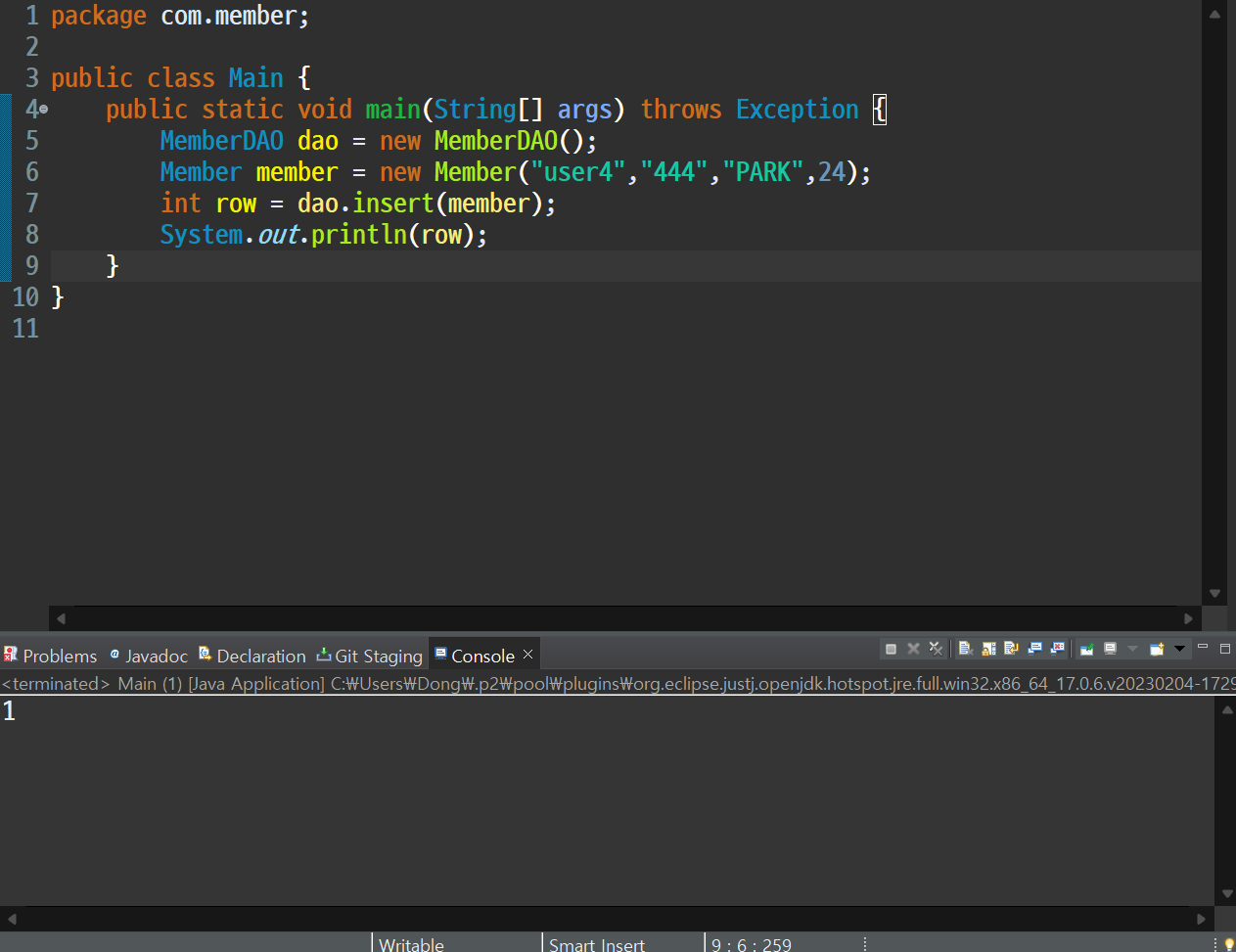 rowCount = pstmt.executeUpdate(); // 실행하여 데이터 삽입 후 결과 반환 (삽입이기 때문에 성공했다면 값 1 반환 실패한다면 에러)