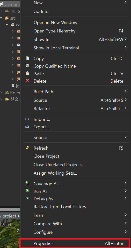 JDBC를 사용할 프로젝트 마우스 오른쪽 버튼을 클릭 -> Properties 클릭