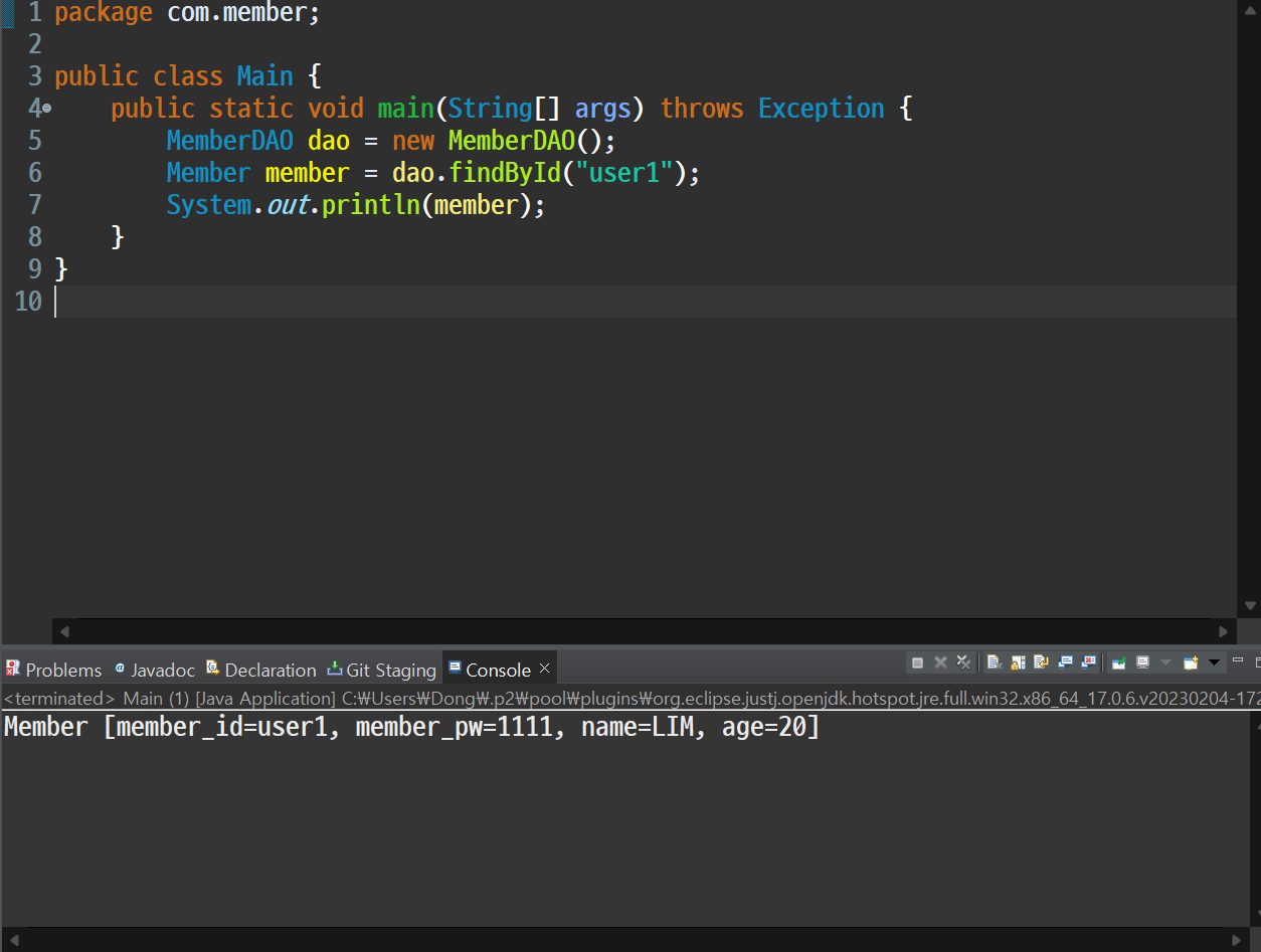 // next()메소드를 호출하여 다음 행이 있는지 확인하고, 첫 번째 행이 있다면 데이터를 추출하여 Member 객체를 생성함.