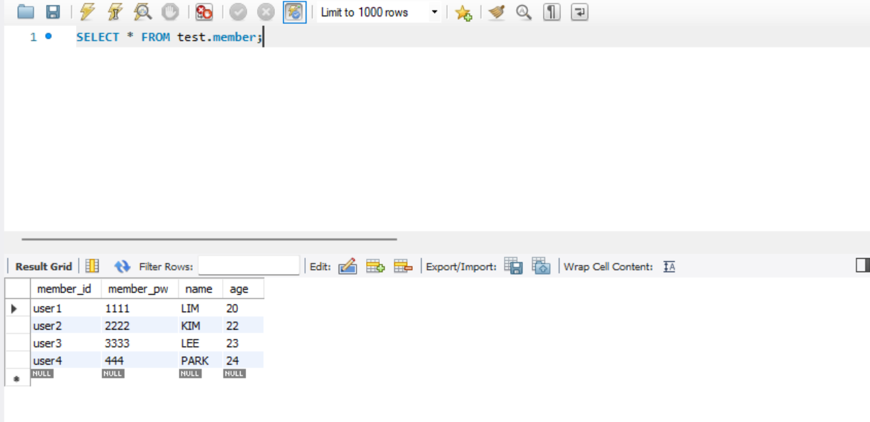 PreparedStatement pstmt = con.prepareStatement("select member_id, member_pw, name, age from member");