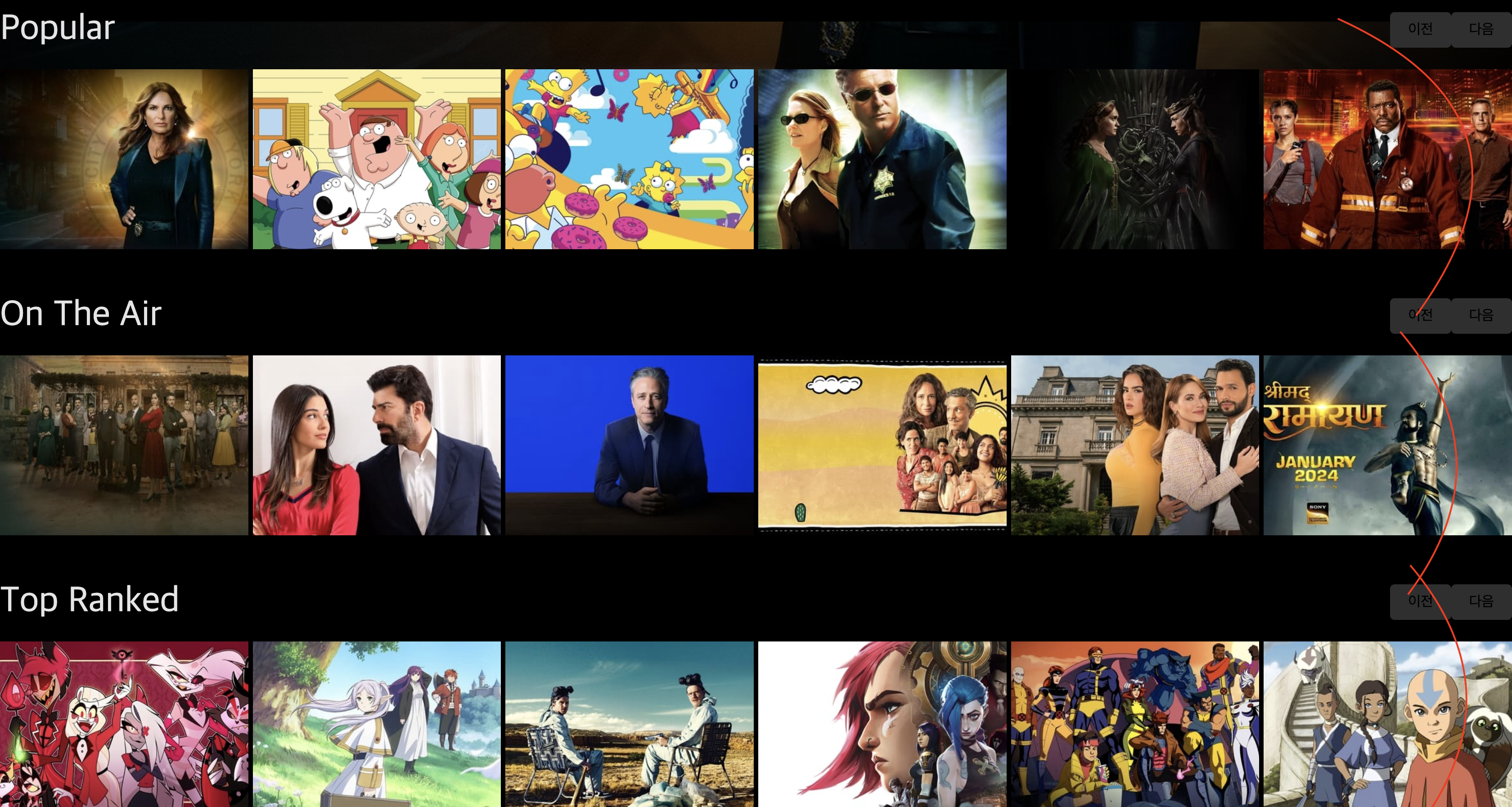 tv부분에서는 --> Popular, On The Air, Top Ranked 3가지이 데이터를 받아오는데, 이는 위에서 설명했듯이 getDistinctTvs()로 서로 겹치는 데이터를 제거해 놓았기 때문에