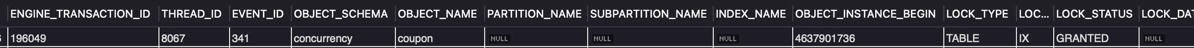 RECORD LOCKS space id 306 page no 4 n bits 72 index PRIMARY of table concurrency.coupon trx id 195989 lock_mode X insert intention waiting