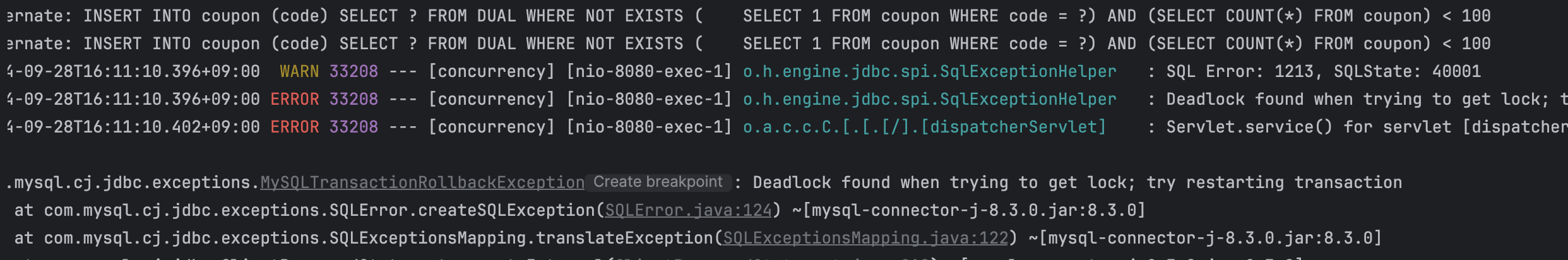 먼저 요청을 딱 하나만 보내는 경우에는 잘 돌아갔다. 하지만 Jmeter 를 이용해 요청을 동시에 2개를 보내는 경우, 바로 위와같은 에러가 다시 나타났다. 그러면 lock 이 쿼리 내에서 발생한것이 아니라 여러개의 쿼리가 DB 로 날아오면서 발생한 것이라 추측할 수 있었다.