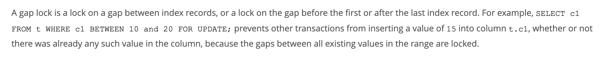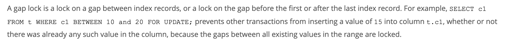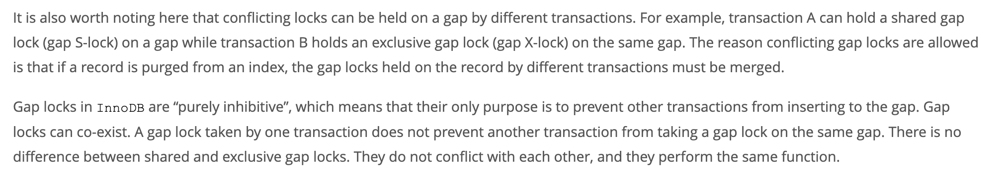 결론은 SELECT .... FOR UPDATE 쿼리를 수행할 때, 해당하는 혹은 만족하는 데이터가 없을 경우, GAP LOCK 이 걸린다, 그런데 이 GAP LOCK 의 경우, S 락 , X 락의 종류에 관계없이 동시에 걸릴 수 있다. 아래는 이에 관한 MySQL 의 공식 문서의 일부이다.