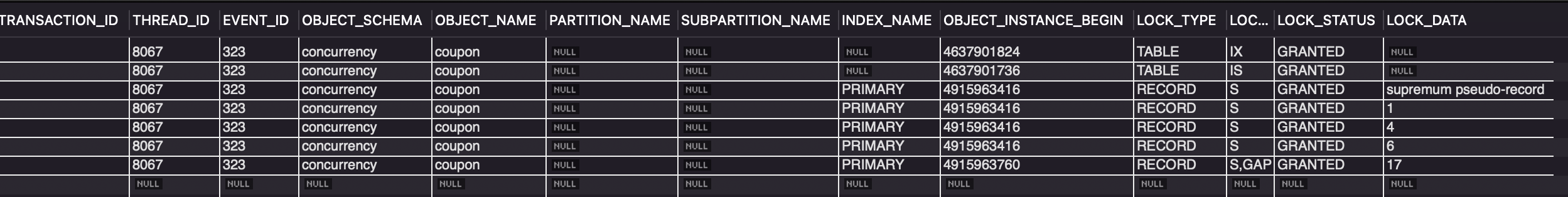 Lock data 는 lock 의 종류마다 다르지만 s 락인 경우 pk 나 인덱스 값을 나타낸다. 현재 coupon 테이블에는 PK 가 1,4,6,13 인 데이터들이 존재한다.