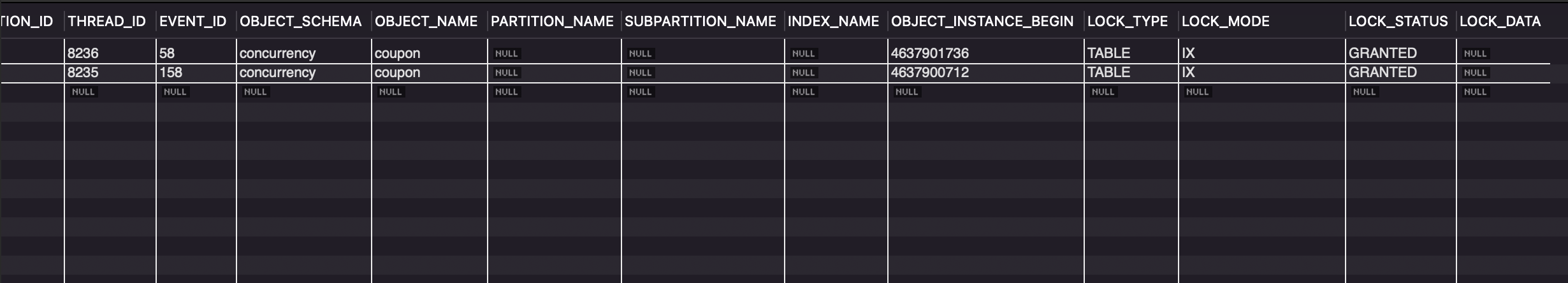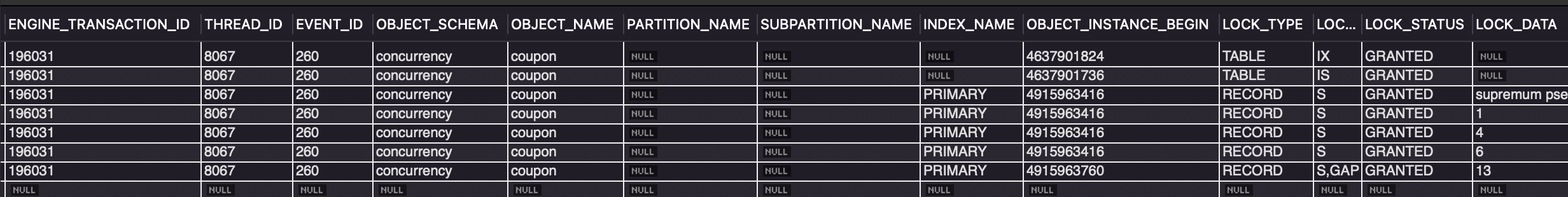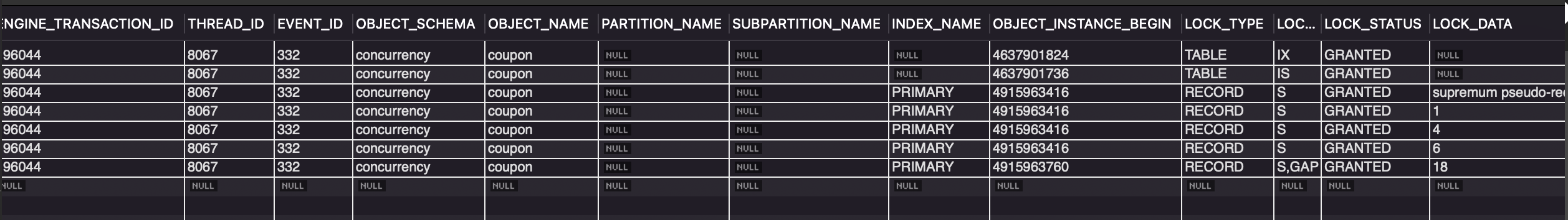 RECORD LOCKS space id 306 page no 4 n bits 72 index PRIMARY of table concurrency.coupon trx id 195990 lock mode S