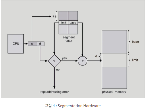 - egment의 길이가 Segment Table의 Entry 중 limit에 담겨있는데 이 값보다 (s, d)의 d가 더 크다면 마찬가지로 trap : addressing error가 걸리게 될 것이다.
