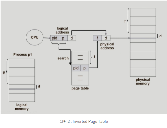 문제점과 효용성 : 페이지 테이블의 공간을 줄이고자 사용한다. 문제는 시간적인 Overhead가 있다. 전부 다 Search를 해야만이 물리적 주소에서 해당 프로세스의 Page p가 어디있는지 알 수 있기 때문이다. 따라서 Inverted Page Table에는 process id(pid)와 Page 번호 p를 함께 저장되어야 한다. 어찌 되었든 Inverted Page Table을 활용하면 공간적인 문제는 해결할 수 있지만 시간적인 문제가 발생하기 때문에 이것을 또 해결하기 위해서는 associative register를 사용하여 이 Entry들을 병렬적으로 동시에 검색할 수 있는 기능이 필요하다.