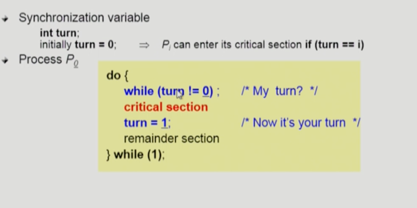 turn이라는 Synchronization variable을 두고, critical section에 들어가기전에, 이번엔 누구 차례인지 알아낸다 (한번씩 번갈아가며)