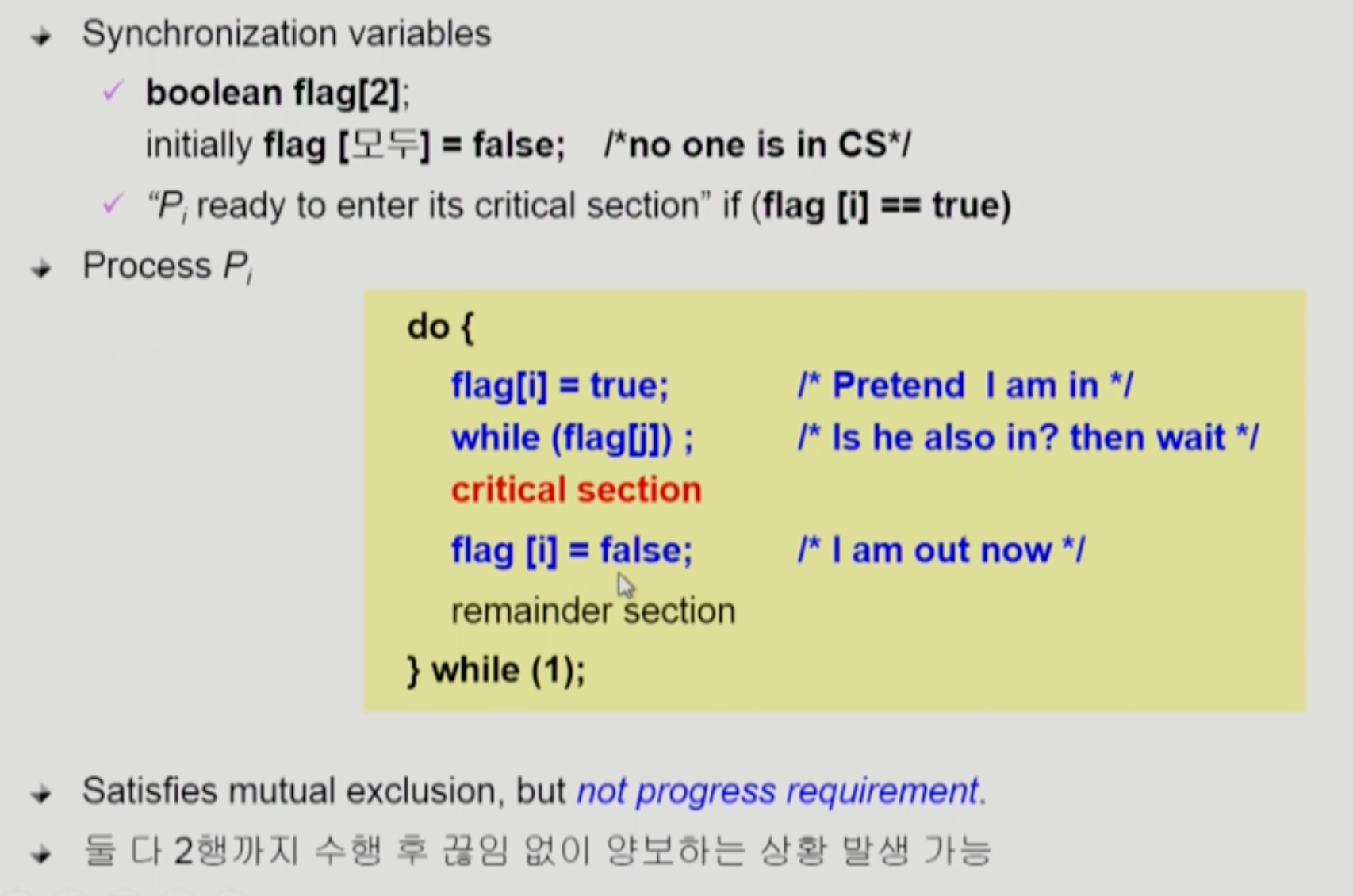 자신의 깃발(flag[i])을 올리고, 상대방의 깃발(flag[j])를 확인한 뒤에 critical section에 입장