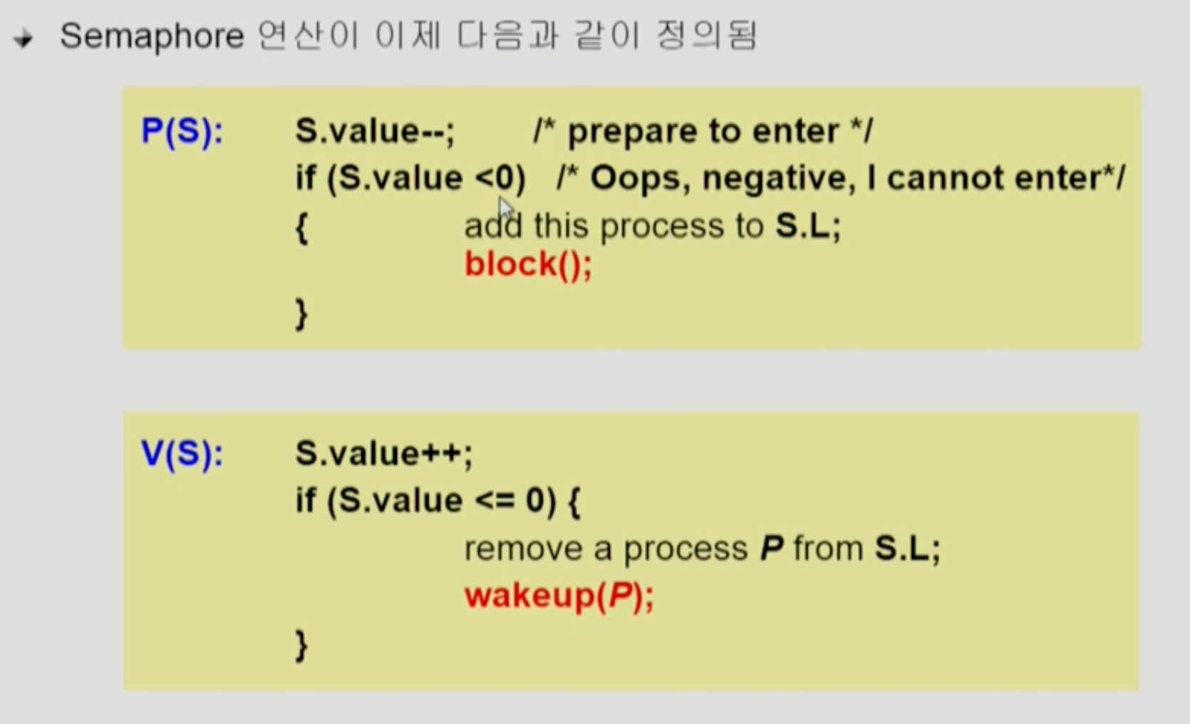 x.wait() 을 호출한 프로세스는 다른 프로세스가 x.signal() 을 호출하기 전까지 sleep