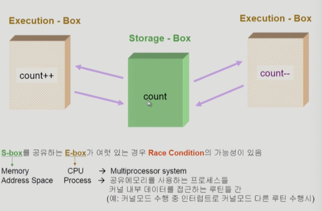 - 커널 모드의 수행이 끝나기 전에는 인터럽트를 받지 않도록 하는 (disable / enable)로 문제 해결 가능