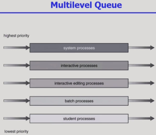 - 1순위 큐에 있는 process가 먼저 CPU를 사용하고, 이후 순위에 따라 CPU를 사용.