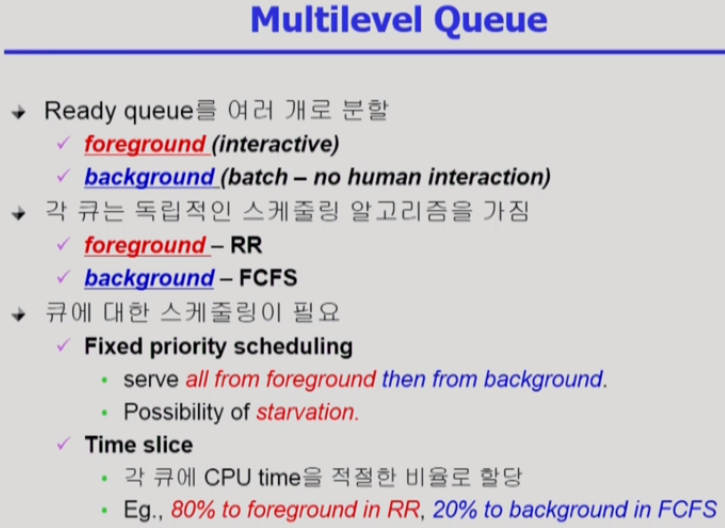 - 두 개의 큐가 있다면 interactiva한 process인 forground가 CPU를 많이 사용하게 된다.