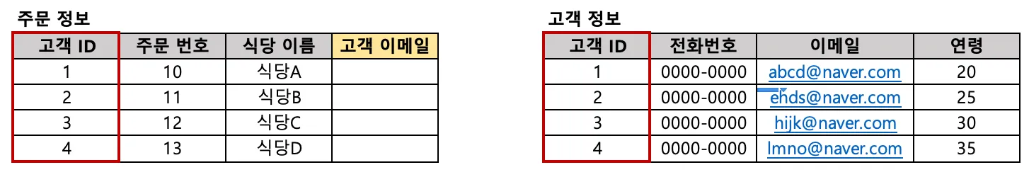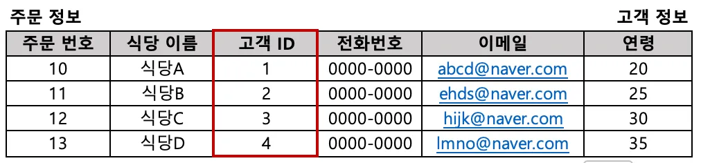 ex) 주문정보에는 ‘고객ID’, 고객정보에는 ‘고객아이디’ 라고 컬럼명이 되어있다면 -> 테이블1.고객ID=테이블2.고객아이디