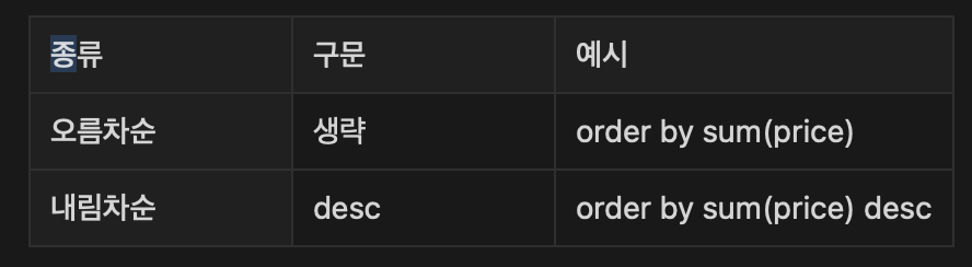 order by 정렬을 원하는 컬럼 (카테고리컬럼(원하는컬럼 아무거나), sum(계산 컬럼) 둘 다 가능)