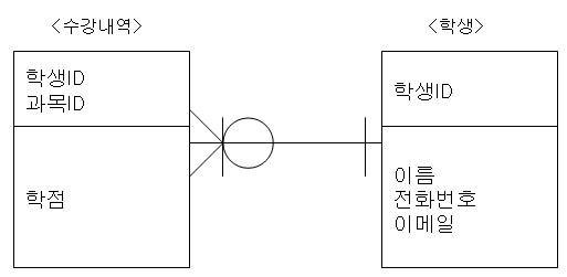 수강내역 테이블에서 학생 테이블의 기본키를 자신도 기본키로 사용하기 때문에 실선으로 표현되어있다.