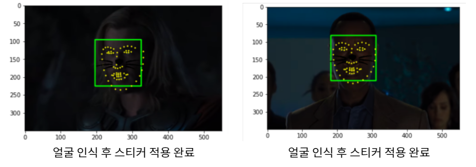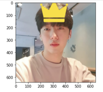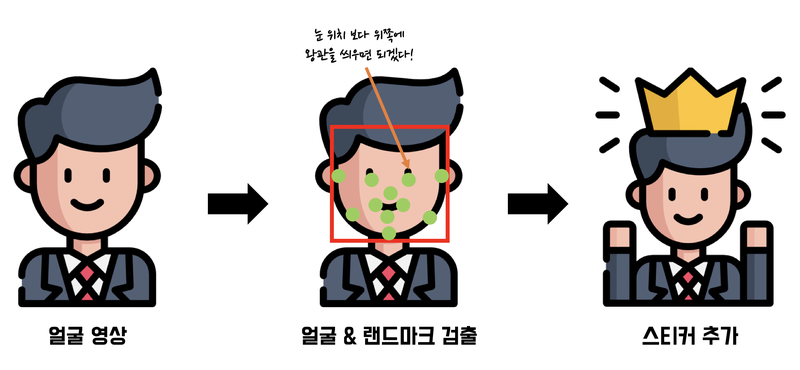 위의 과정으로 얼굴을 인식하여 적절한 위치에 스티커 이미지를 부착해보았다.