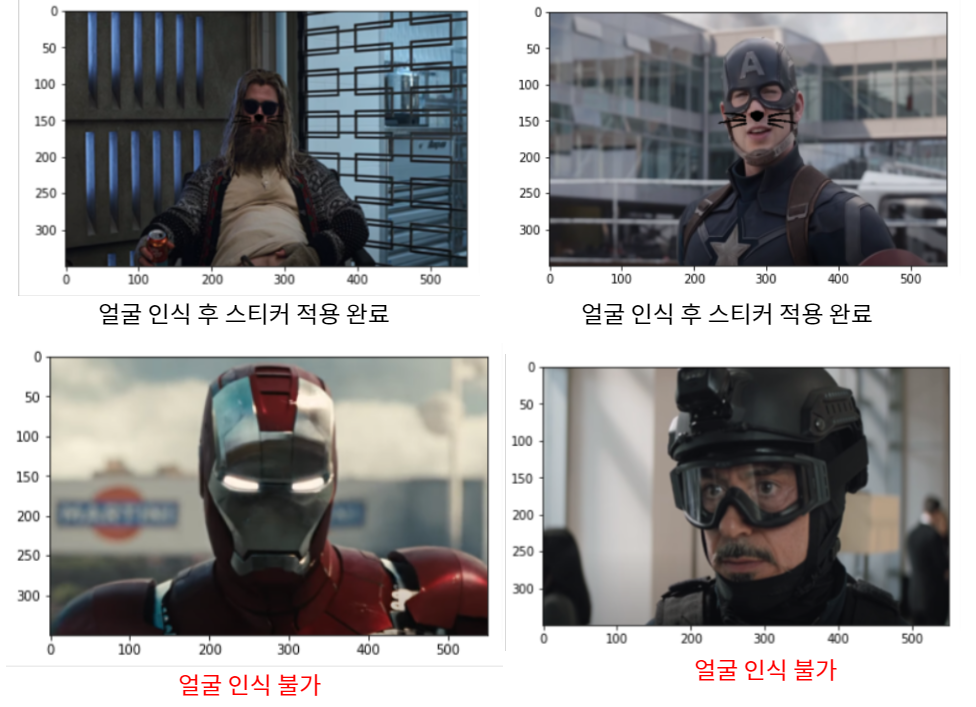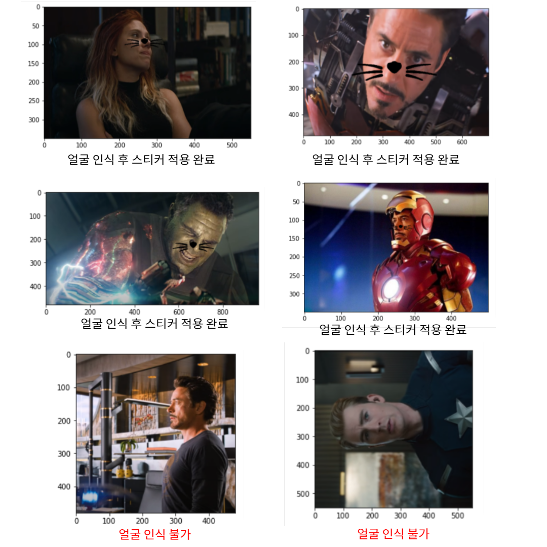 추가적으로 어벤져스 등장인물의 이미지를 이용해 다양한 밝기와 다양한 각도 사진에 대해서도 동일한 과정을 진행하였다.