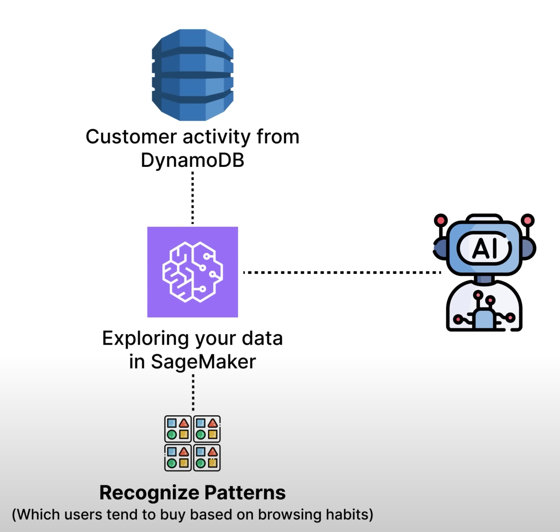Amazon Bedrock: 단일 API를 통해 사전 구축된 최첨단 AI 모델(Anthropic, Meta 등)에 접근할 수 있게 해줍니다. 고급 AI를 사용하는 지름길입니다.RAG (Retrieval Augmented Generation): Bedrock 모델이 문맥에 맞는 답변을 제공하기 위해 사용자의 데이터베이스(예: 제품 정보, FAQ)에서 실시간으로 특정 데이터를 가져올 수 있도록 합니다. 예: 회사 데이터를 활용한 챗봇 구축.