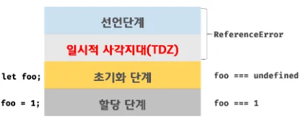 '선언 단계'와 '초기화 단계'가 분리되어 진행된다. 즉, 런타임 이전에 스코프 최상단에 선언 단계가 실행되지만 초기화 단계는 변수 선언문에 도달했을 때 실행된다. 따라서 선언문 이전에 변수에 접근하려고 하면 참조 에러가 발생한다. 일시적 사각지대(TDZ)라고 부른다. TDZ 구간 때문에 변수를 참조할 수 없어서 호이스팅이 동작하지 않는 것처럼 보이는 것이다.💡 호이스팅