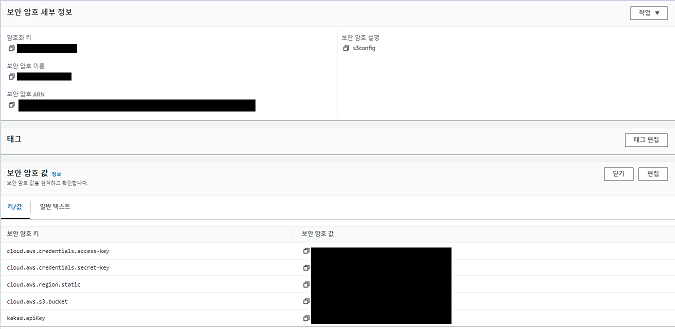 값을 다음처럼 넣습니다 이름은 /secret/s3config 의 s3config를 넣었습니다