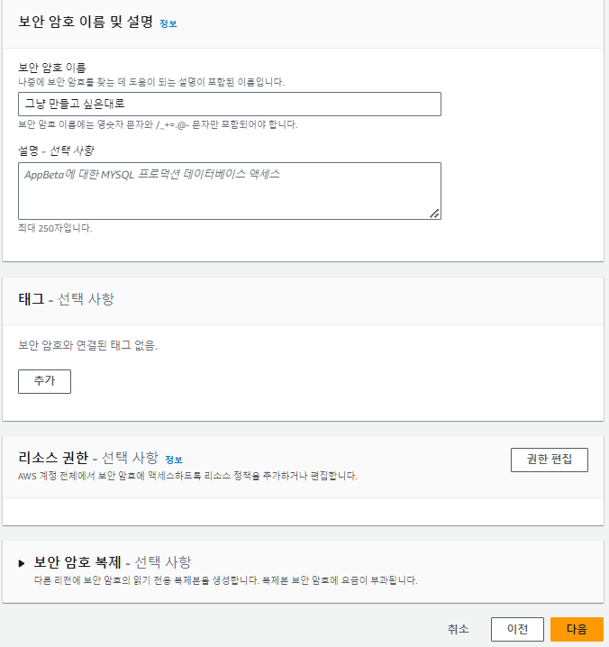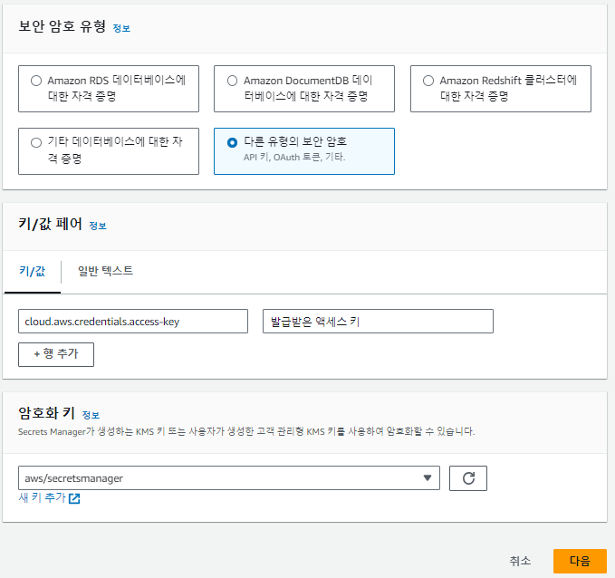 그러나 이러한 방식은 귀찮고 번거로워서 다른 대안을 찾아보다 AWS Secret Manager를 알게되어 사용방법을 기록하고자 합니다.