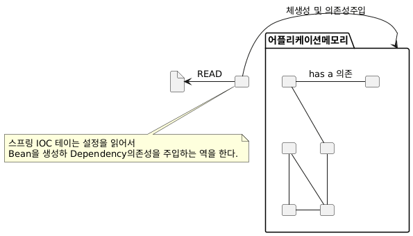 DI란 스프링 IOC(Inverse of Control) 컨테이너가 Bean의 의존관계를 설정에 따라서 주입하는 일을 말한다. 일반적인 자바 어플리케이션이 new키워드를 통해서 객체를 생성하고 의존관계를 개발자가 직접 지정하는데 반해서, 스프링 프레임워크는 스프링 IOC 컨테이너가 설정에 (xml파일, Annotation, BeanConfig) 따라 자동으로 Bean을 생성하고 주입하는 역할을 한다.