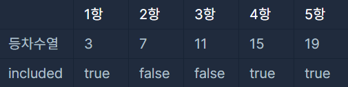 예제 2번은 a와 d가 각각 7, 1이고 included의 길이가 7입니다. 이를 표로 나타내면 다음과 같습니다.