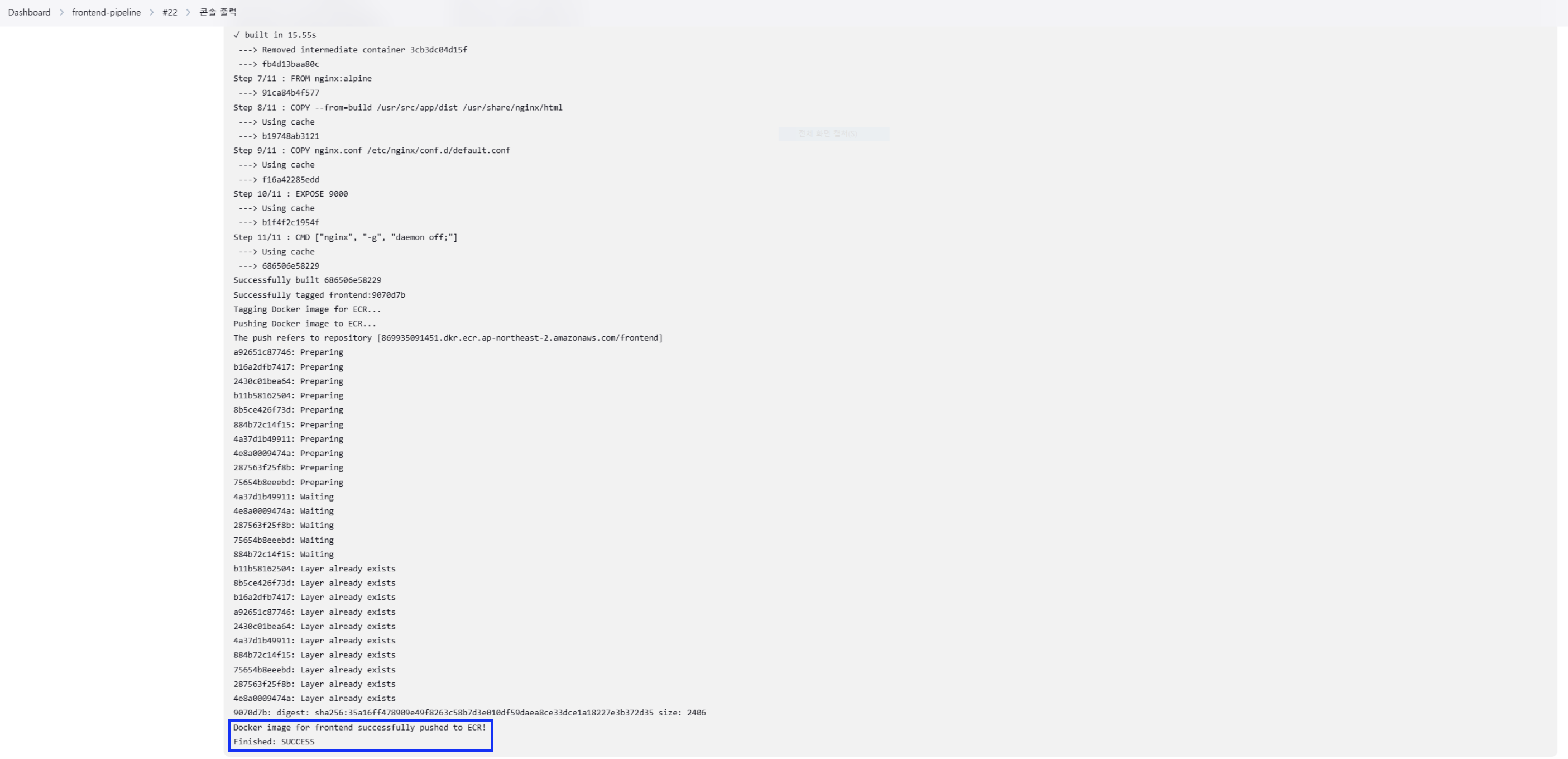 파이프라인이 돌아가고 아래처럼 뜨면 파이프라인이 잘 설정되고, 이미지도 성공적으로 푸시된겁니다! 🥳