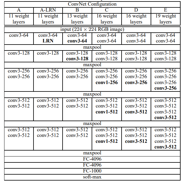 All configurations follow the generic design presented in Sect. 2.1, and differ only in the depth: from 11 weight layers in the network A (8 conv. and 3 FC layers) to 19 weight layers in the network E (16 conv. and 3 FC layers).