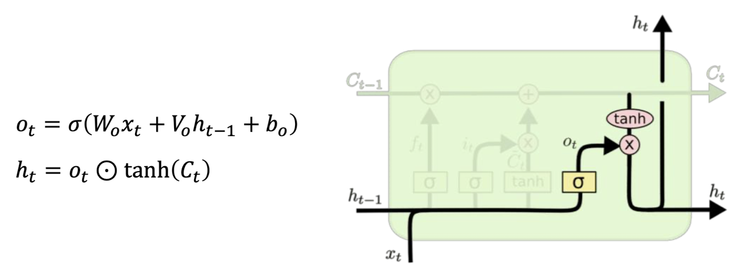- 수식: (ot=σ(Woxt+Voht−1+bo))