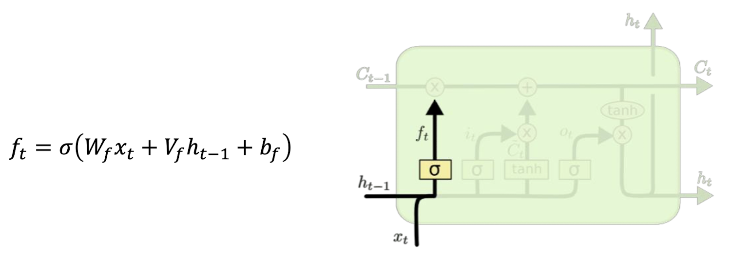 - 수식: (ft=σ(Wfxt+Vfht−1+bf))