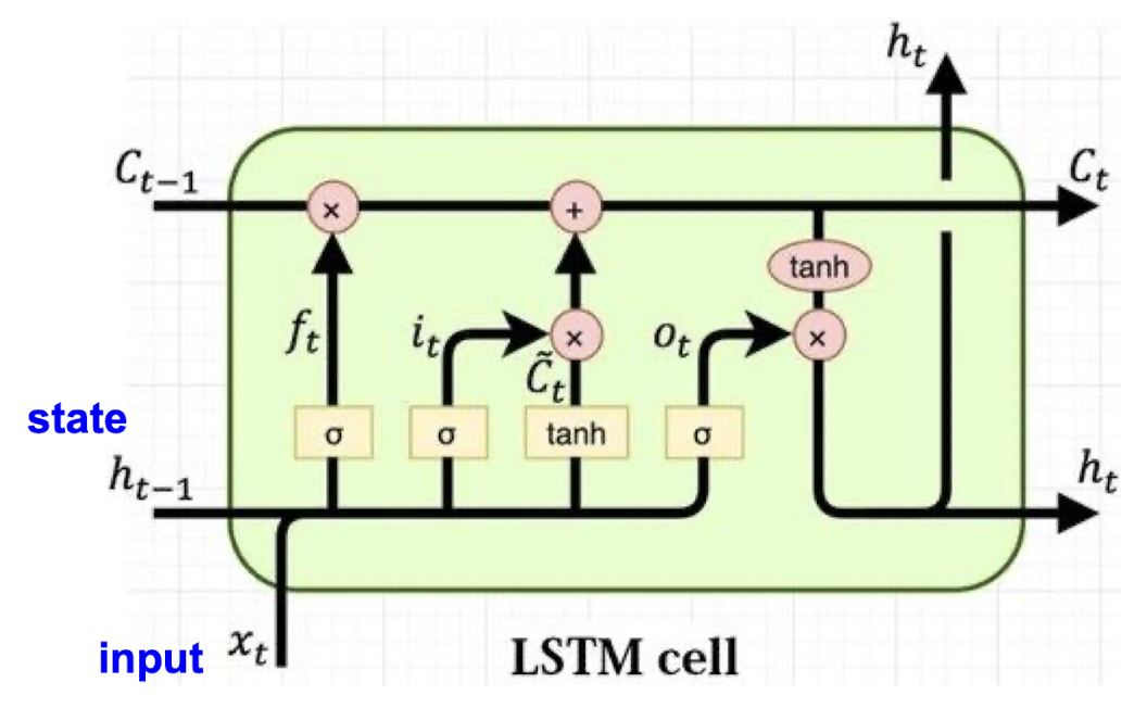 - 숨겨진 상태 (hidden state, (ht))와 셀 상태 (cell state, (Ct)):