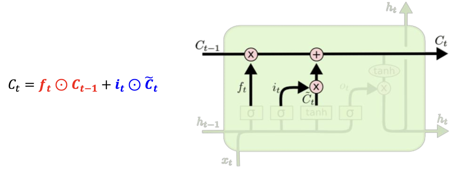 - 수식: (Ct=ft⊙Ct−1+it⊙Ct~)