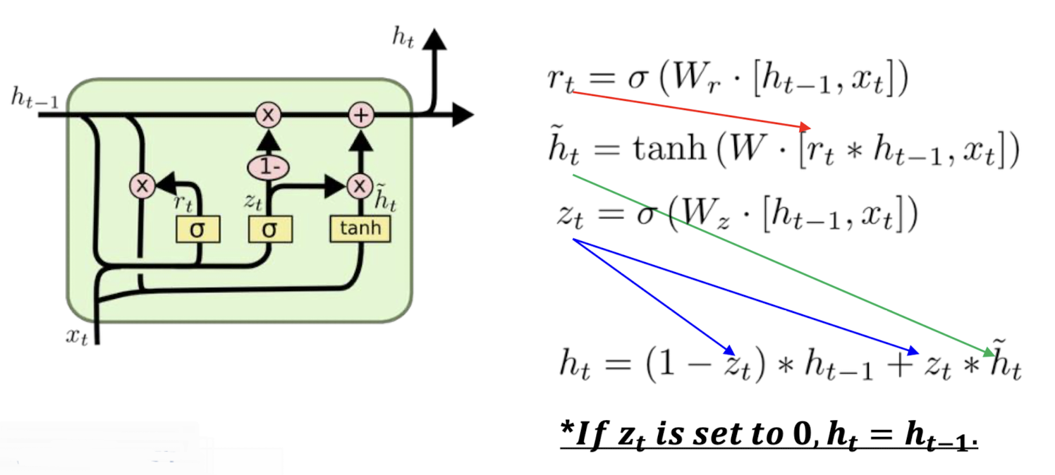 - 리셋 게이트 (rt)는 현재 입력 (xt)와 이전 상태 (ht−1)를 이용하여 계산됩니다.