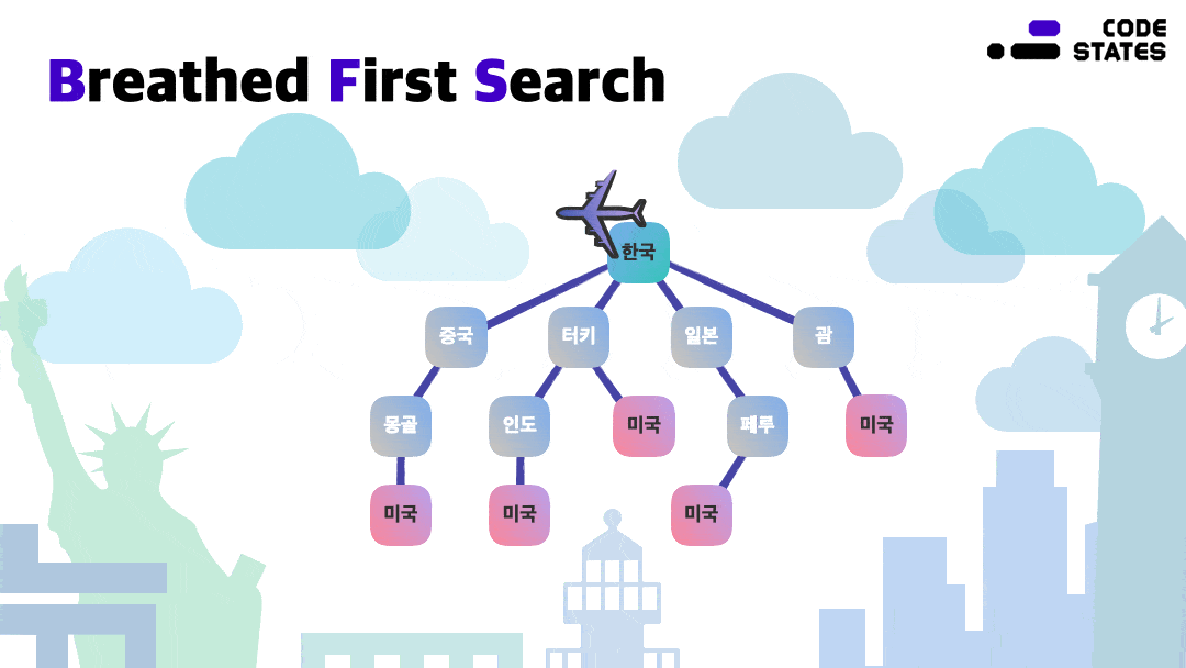 직항이라면 한국과 미국 사이에 어떠한 경유지도 없기 때문에 제일 가까운 정점에 미국이 있고, 경유지가 있다면 직항보다 거리가 멀다는 사실을 확인할 수 있다.