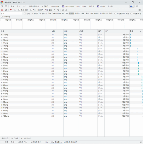 loading 속성 때문에 뷰포트에 해당 이미지가 보이는 순간 이미지 받아오는 요청을 보내는 모습을 확인할 수 있다.