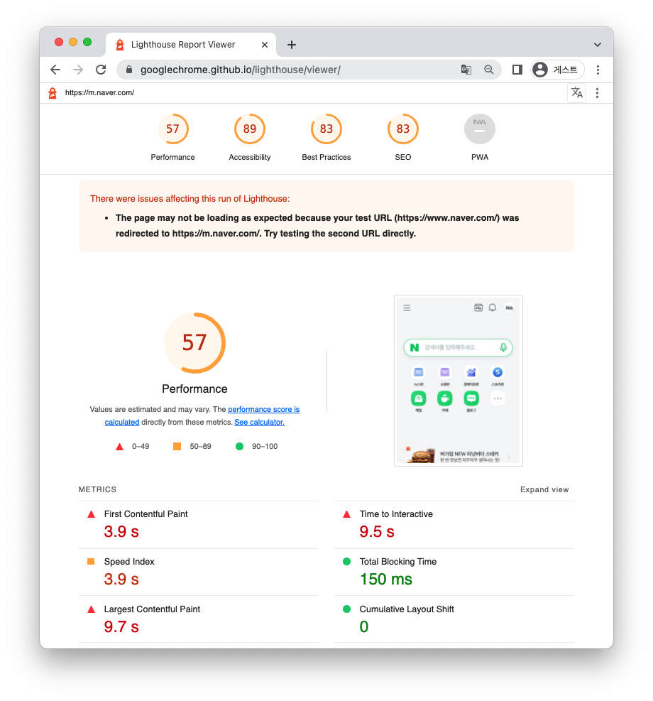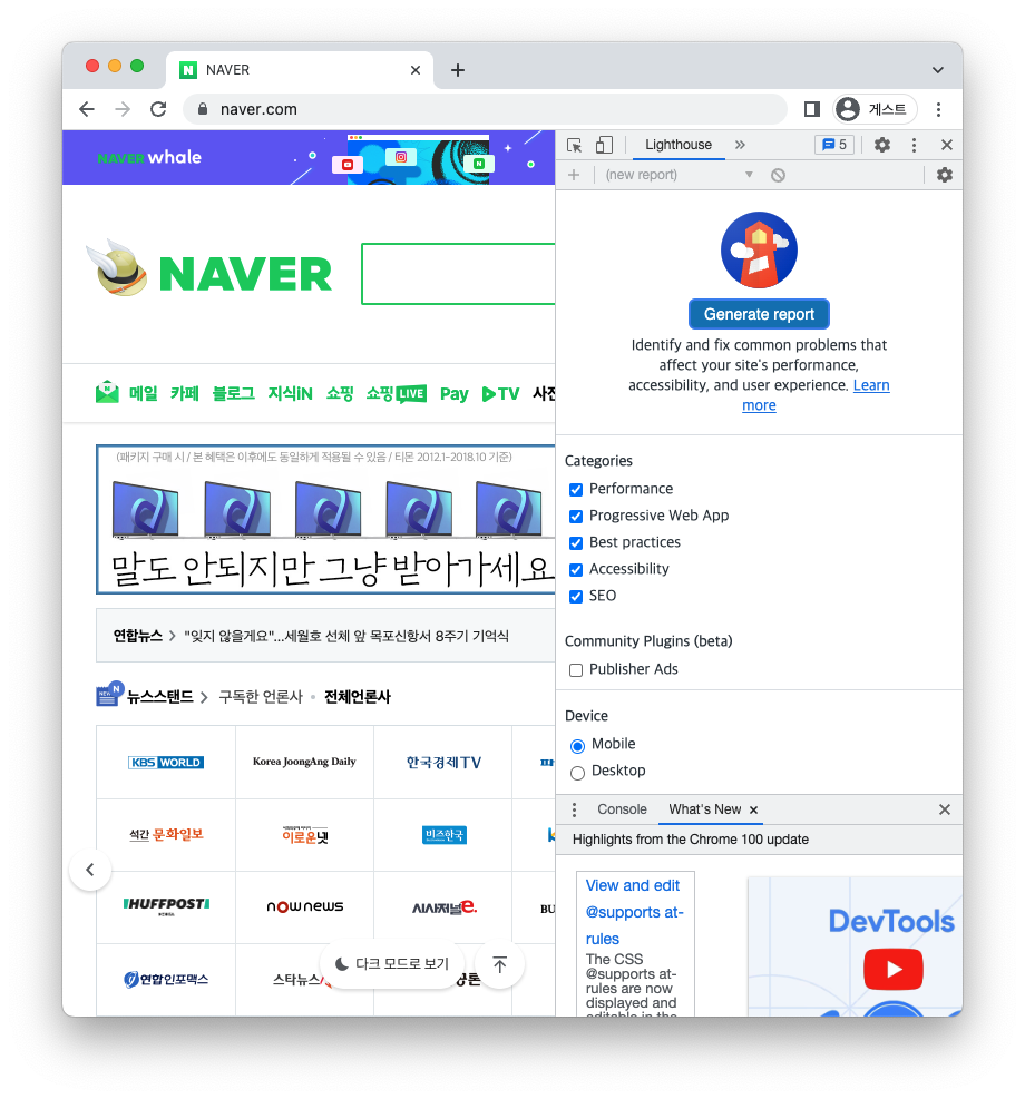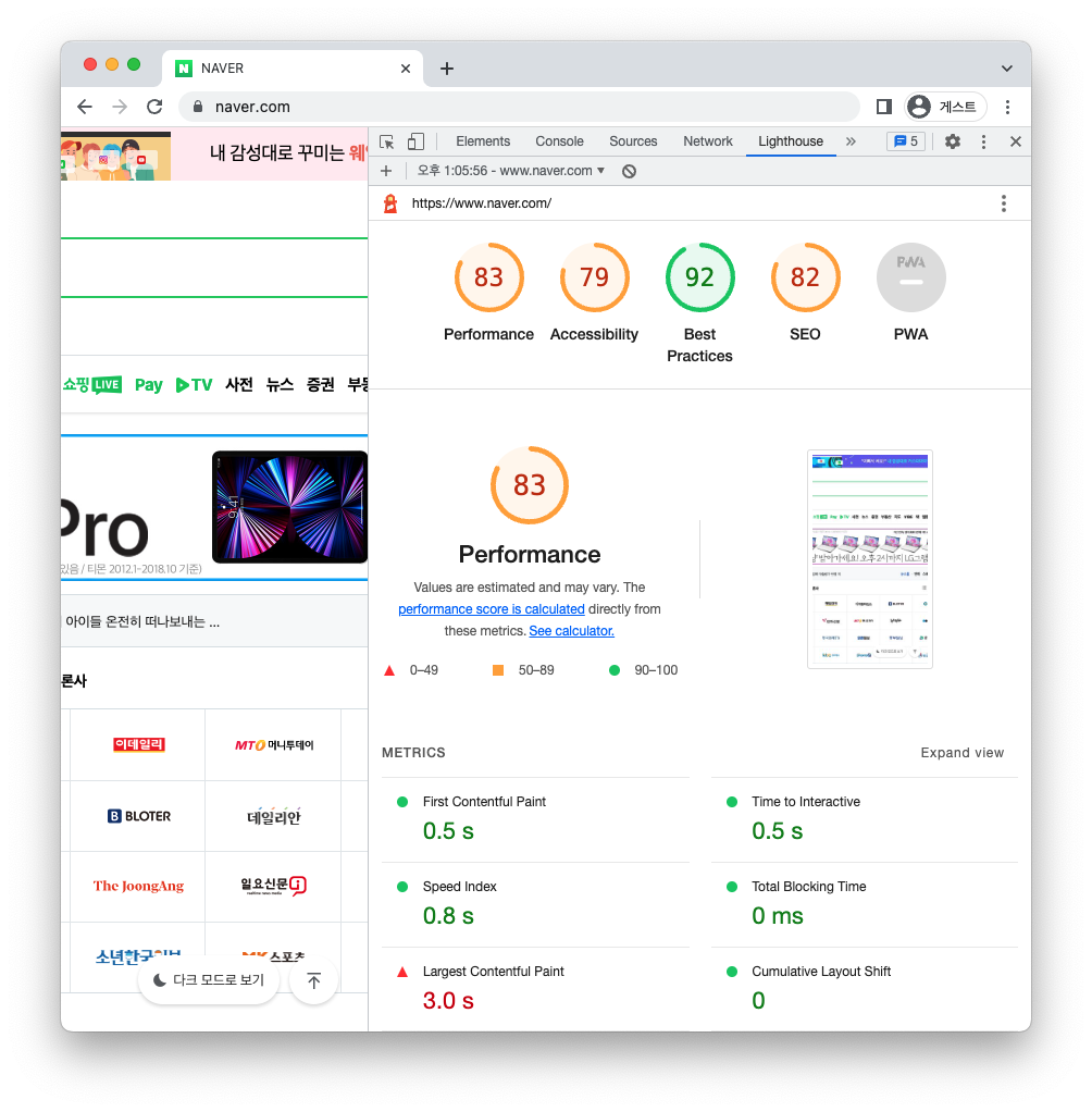 대략 30-60초간 검사가 실행된 후 아래와 같이 리포트가 해당 페이지의 개발자 도구내에 생성된다.