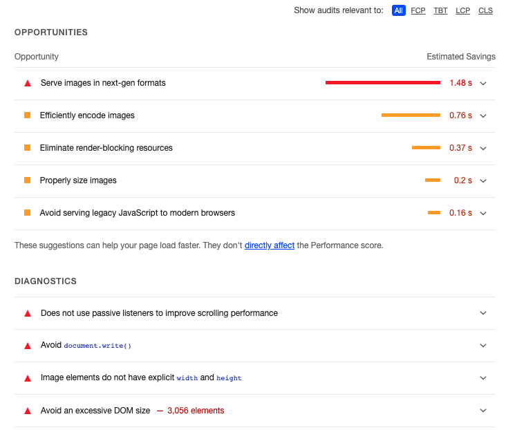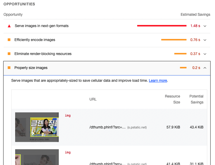 Lighthouse는 성능을 측정할 뿐 아니라 무엇이 시간을 많이 소모하는지, 어떻게 개선하여 최적화를 할 수 있을지 해결책도 제시해준다. Opportunities 항목을 확인하면 각 메트릭별 문제를 확인할 수 있다.