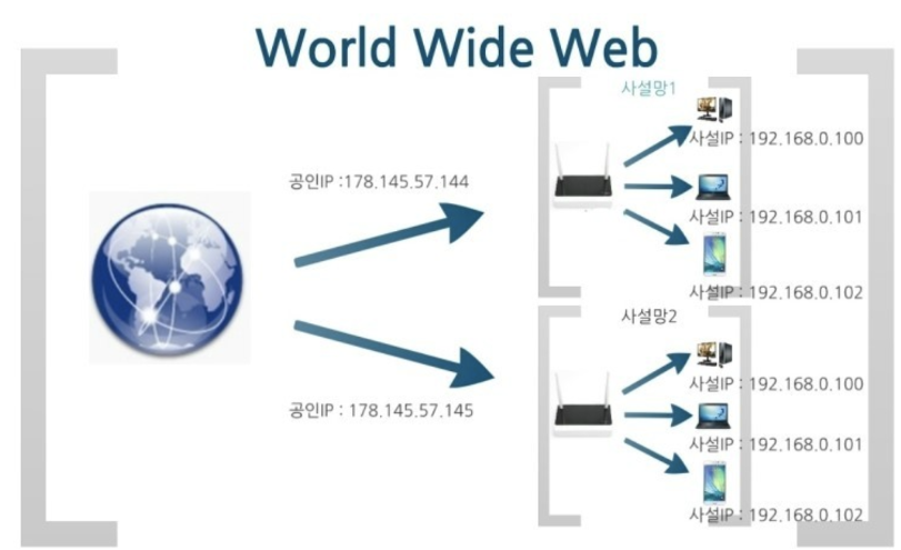 서설 IP를 할당받은 스마트폰 혹은 개인 PC가 데이터 패킷을 인터넷으로 연결하면, 라우터(공유기)가 해당 사설 IP를 공인 IP로 바꿔서 전송한다.