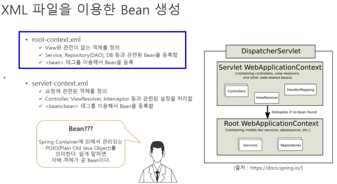 xml 파일에서 <bean>이라고 하는 태그로 객체를 만들 수 있다.
