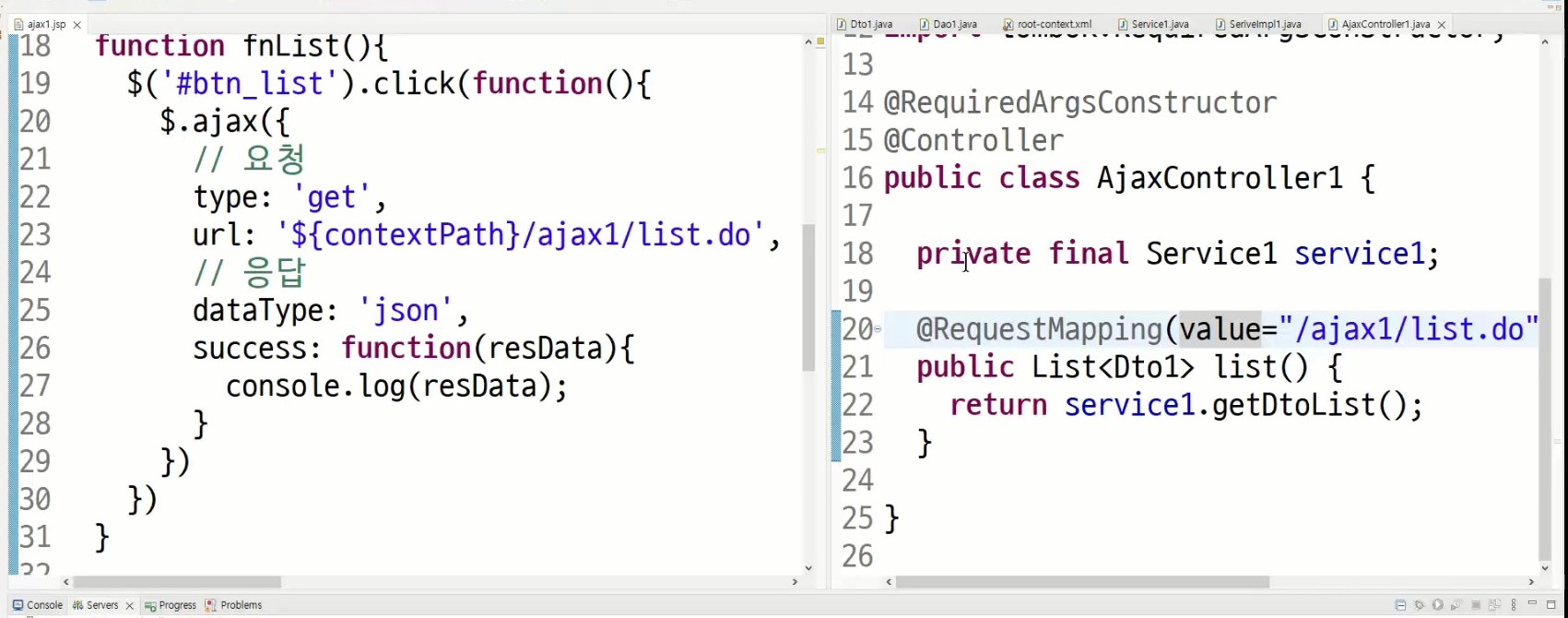 사진에서 오른쪽이 컨트롤러고 왼쪽은 데이터 받아야하는 ajax1.jsp다